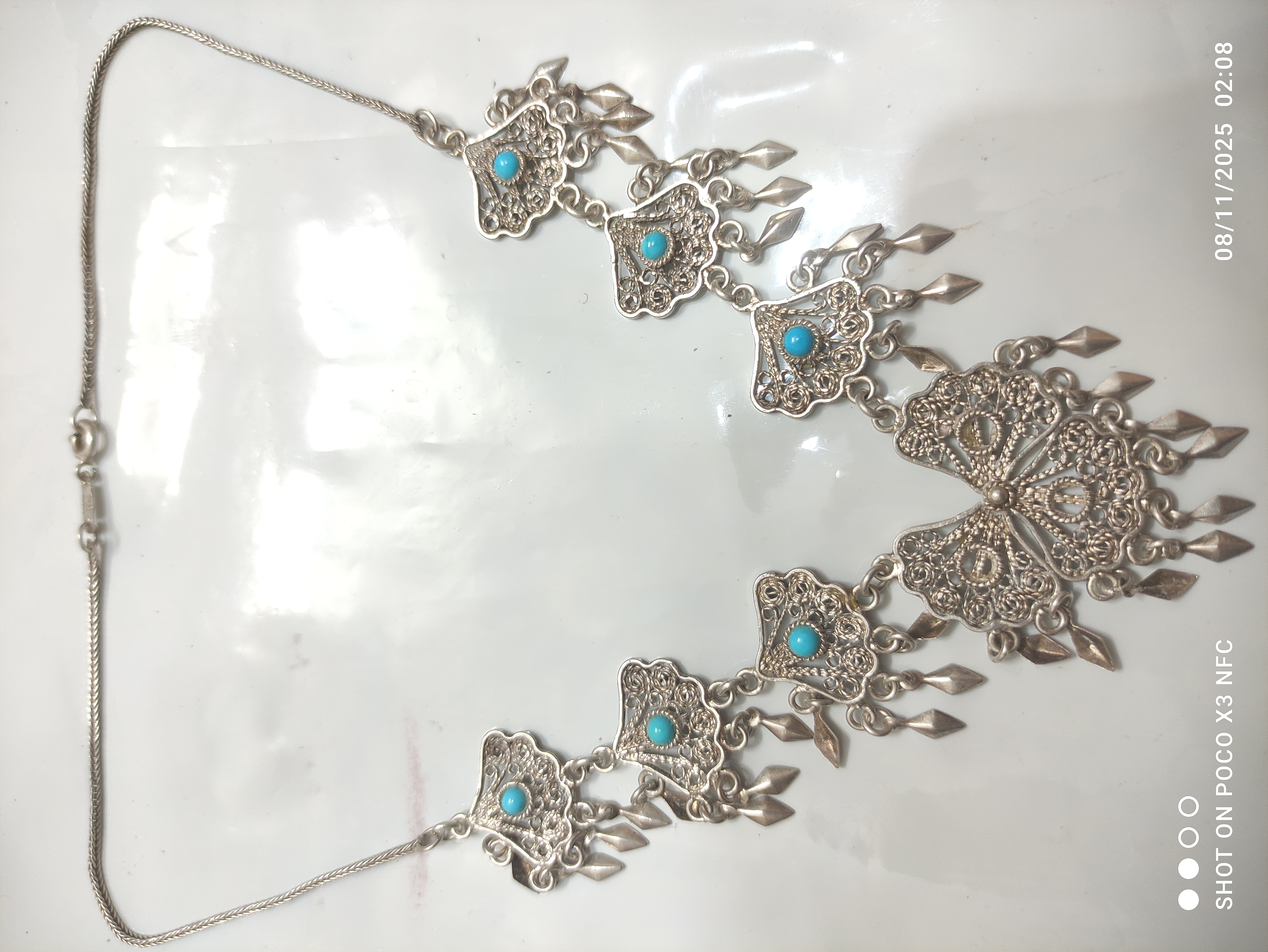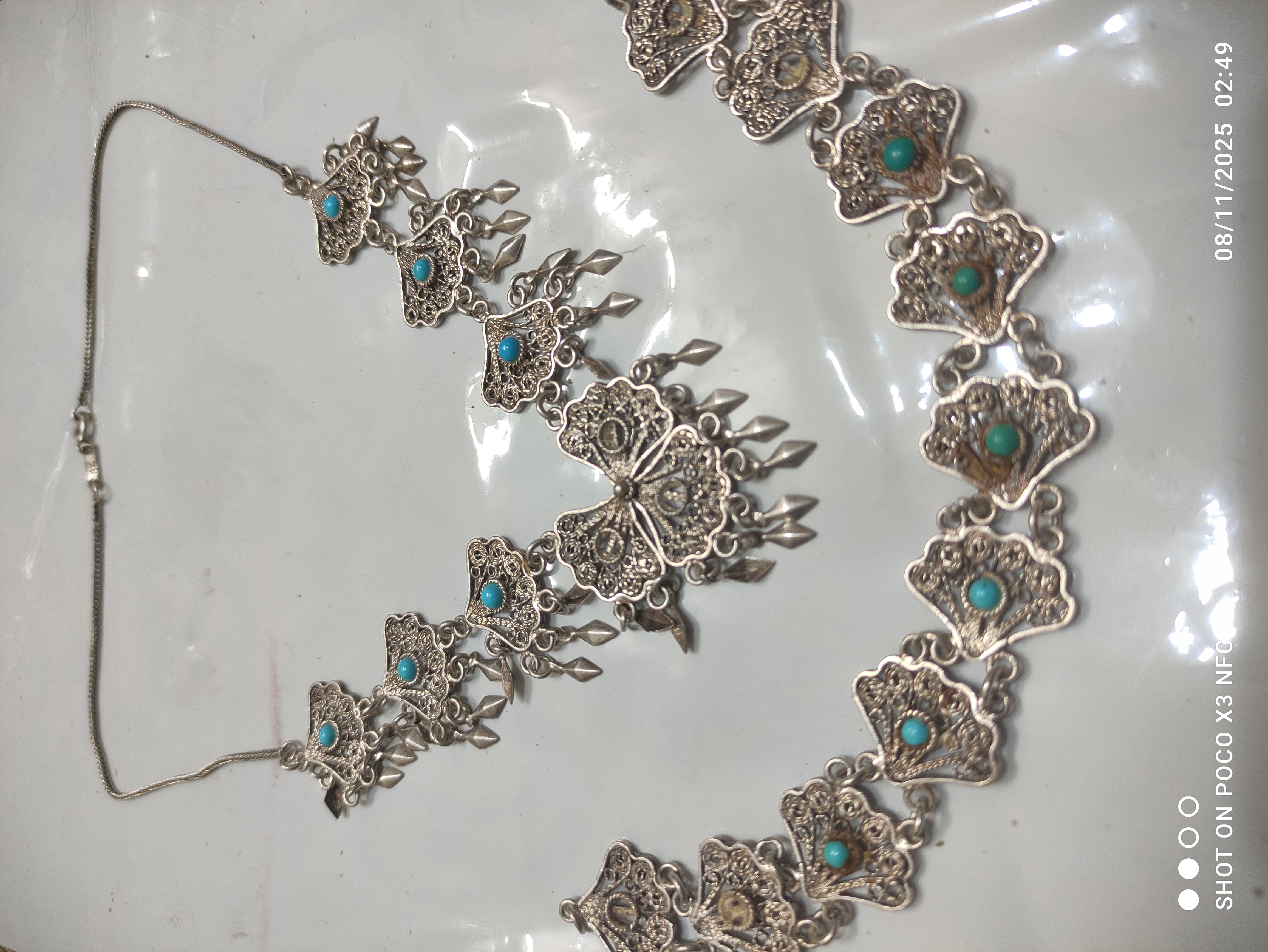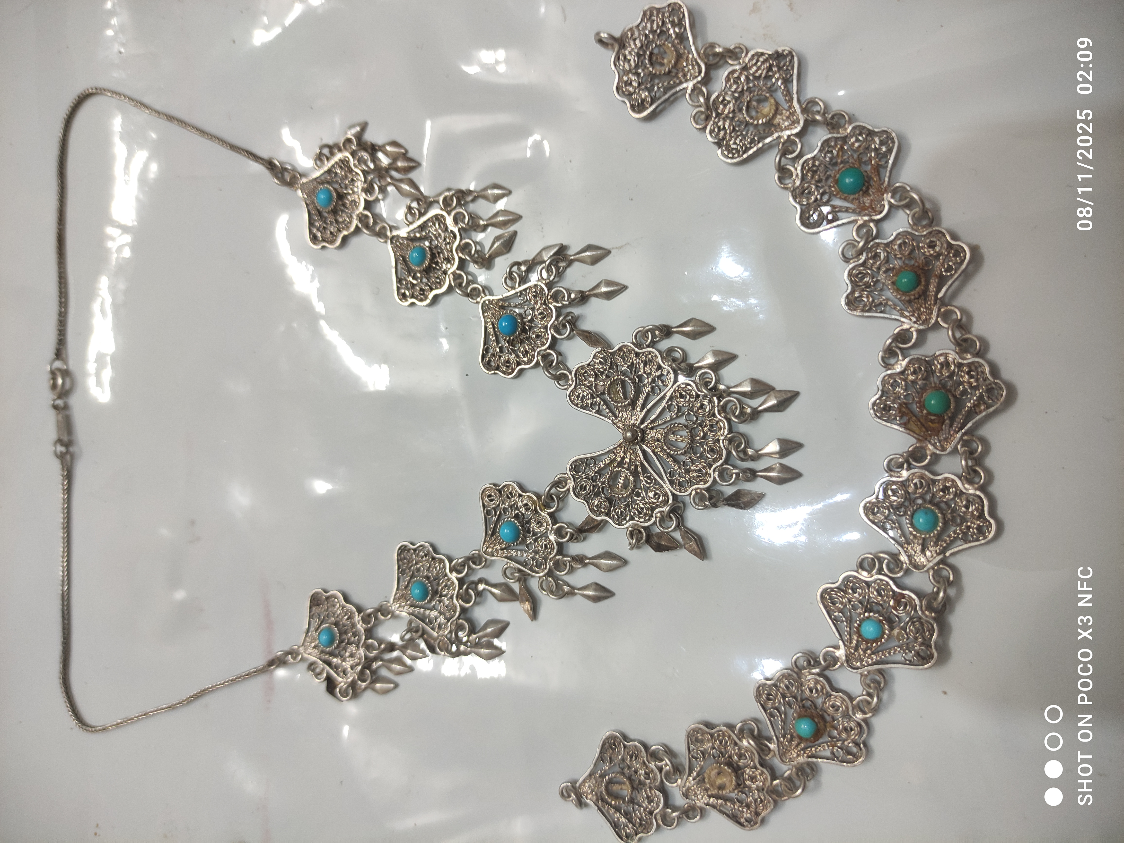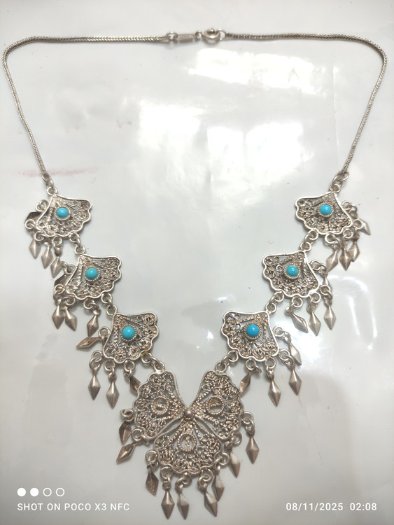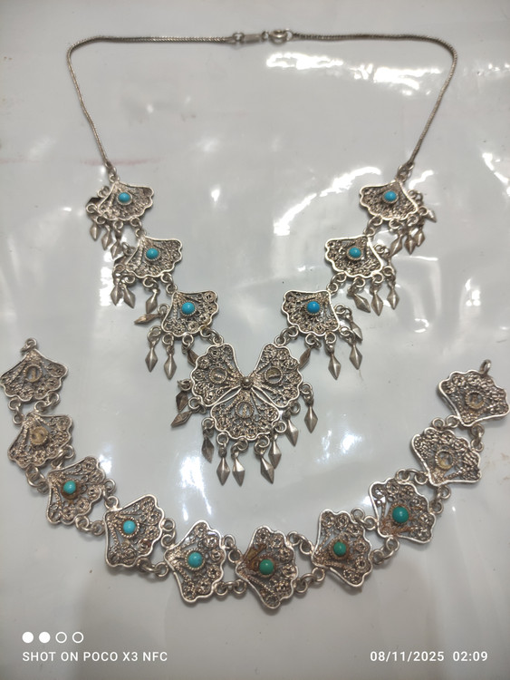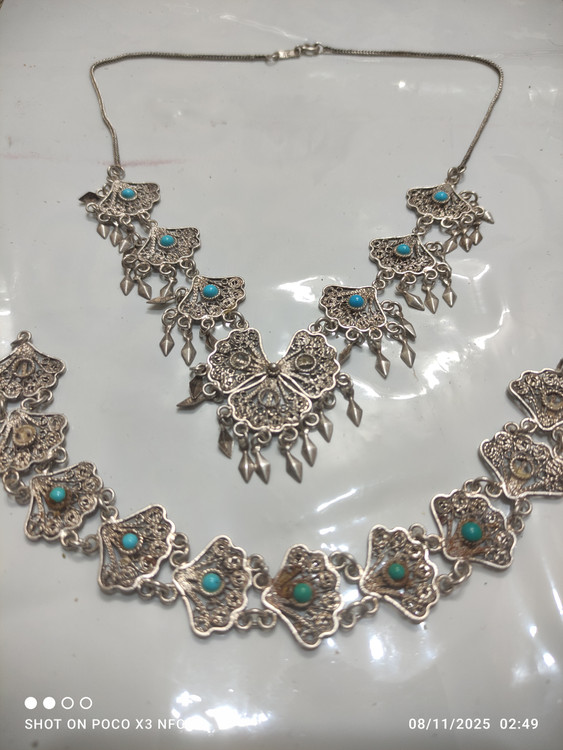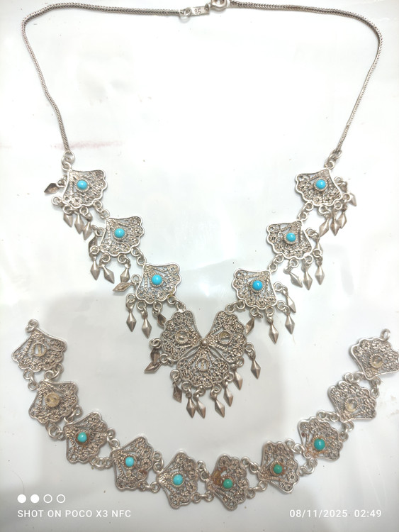 گردنبند و دستبند با نگینهای فیروزه نیشابوری قدیمی اما نو فقط چند تا از نگین فیروزه ها افتاده که موقع ارسال براتون میزارم قفل و زنجیر و خود گردنبند تمامأ از نقره خالص درست شدهبسیار شیک و خاص